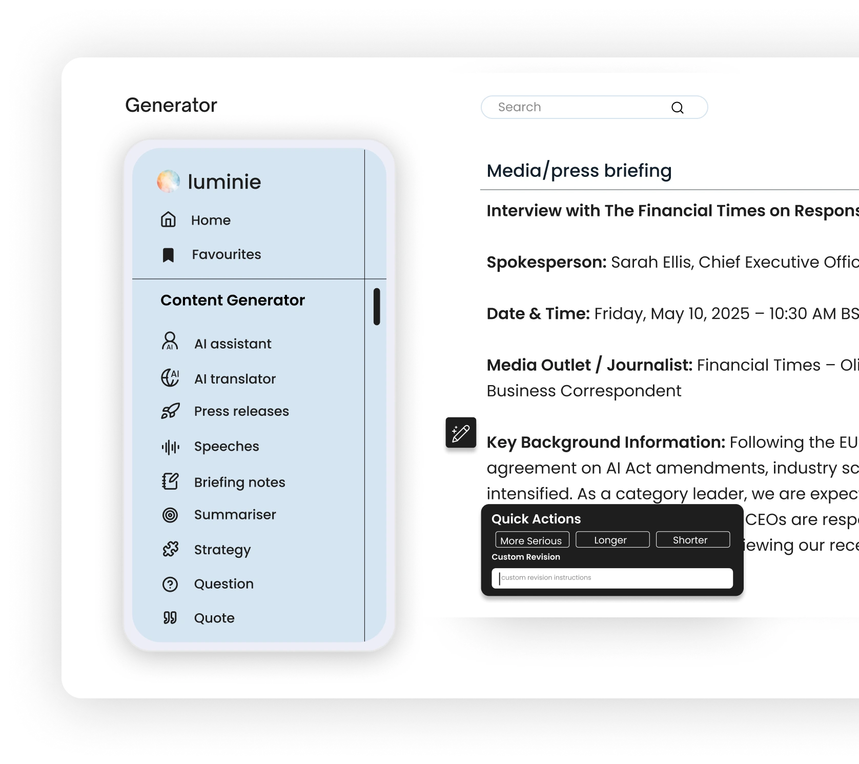 Craft press releases, internal briefings, and comms strategies in minutes — not hours. albie helps you move faster, stay on-message, and elevate every word.